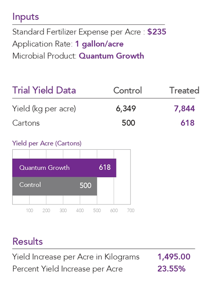 The technical support team at Ecological Labs developed a protocol for inoculating a trial section of the farm with Quantum Growth. The evidence of faster, healthier growth was evident just 16 days after planting. At harvest, the treated crops showed a 30% increase in yield versus control, from 8,800 to 11,424 average pounds per acre. The treated plants appeared significantly healthier throughout the trial. The microorganisms in Quantum Growth work naturally to provide food and energy for plants allowing them to focus on root growth and fruit production. This results in a healthier, heartier plant with increased yields and decreased dependency on supplemental irrigation, fertilizer, and pesticides.