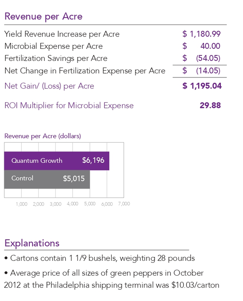 Conduct a trial to determine the benefit of incorporating 1 gallon of Quantum Growth into their Green Pepper protocol (64 oz at transplant, 32 oz at pre-bloom and 32 oz at fruit set).