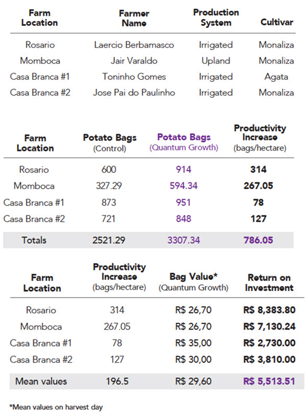 Treatment with Quantum Growth improved overall productivity by 31%, providing an increased revenue of R$ 5,513.51. The University concluded that based on the results of the experiment, Quantum Growth Technology successfully demonstrated its potential as a productivity enhancer and results indicate that it can be used on the Brazilian Potato Production System with success.