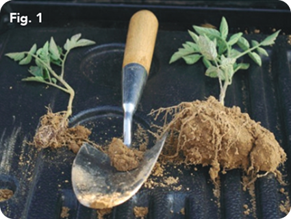Control (left) and treated (right) 7 days after outplanting from the greenhouse. Visual difference in root mass and stalk girth. Note how the control root mass still maintains much of the shape of the tray it was outplanted from.