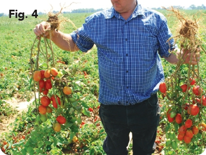 Control (left) and treated (right) during fruit set. Along with larger root mass and stalk girth, the treated plants were setting more tomatoes.